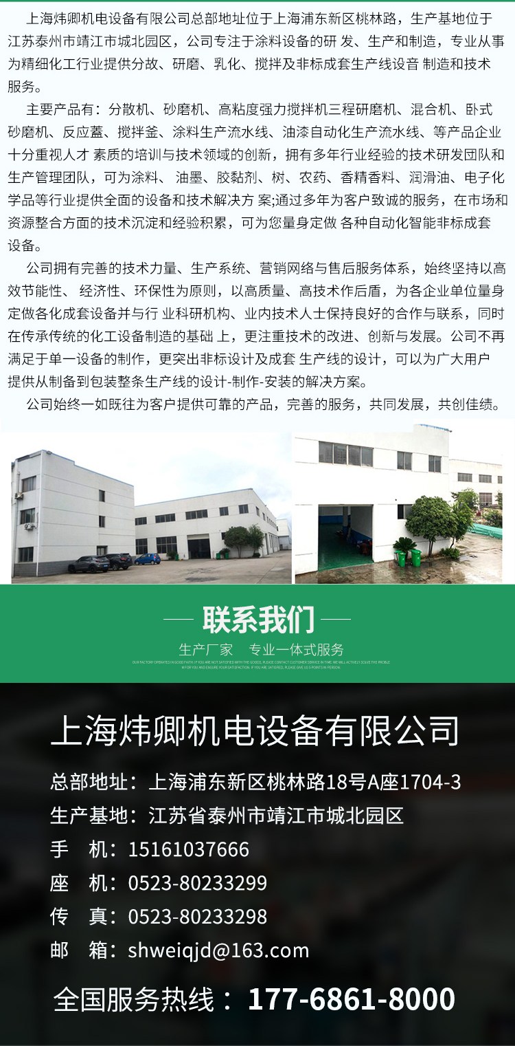 本网页所展示的有关【炜卿机电 防腐涂料成套设备 乳胶漆 颜料化工釜 定制方案】的信息/图片/参数等由的会员【农业科技 】提供,由第 一 市 集会员【农业科技 】自行对信息/图片/参数等的真实性、准确性和合法性负责,本平台(本网站)仅提供展示服务,请谨慎交易,因交易而产生的法律关系及法律纠纷由您自行协商解决,本平台(本网站)对此不承担任何责任。您在本网页可以浏览【炜卿机电 防腐涂料成套设备 乳胶漆 颜料化工釜 定制方案】有关的信息/图片/价格等及提供 【炜卿机电 防腐涂料成套设备 乳胶漆 颜料化工釜 定制方案】的商家公司简介、联系方式等信息。